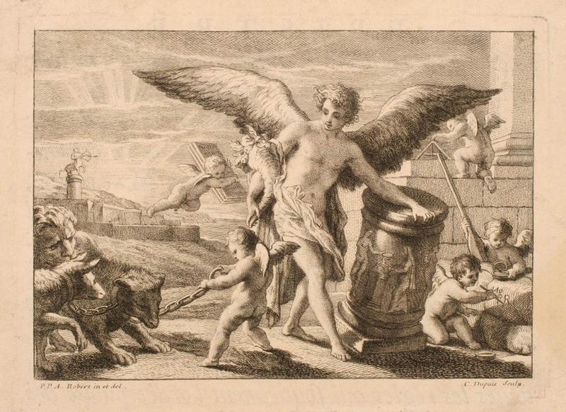 lettre, en bas à droite : sur une pierre : 10/D R ; lettre, sous le trait carré : à gauche : P. P. A. Robert in et del et à droite : C. Dupuis Sculp ; annotation, dans la marge inférieure : au crayon : La civilisation, Allégorie