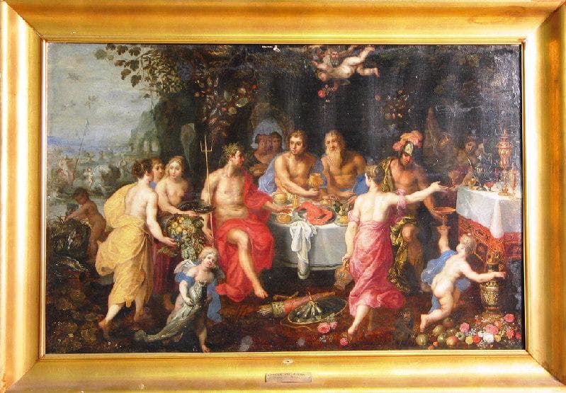 Le banquet des dieux est le symbole de la vie heureuse dans l'abondance et la paix ; Homère y fait référence dans l'Illiade. Ce thème mythologique est repris à la Renaissance, en particulier dans le maniérisme nordique, au début du 17ème siècle. Hendrick van Balen l'a souvent traité, parfois en collaboration avec Jan Brueghel de Velours ; l'oeuvre du musée Denys-Puech peut être rapprochée notamment d'une huile sur cuivre conservée par le musée des Beaux-Arts d'Angers 'Le Banquet des Dieux' (vers 1606-1610) par Hendrick van Balen et Jan Bruegel de Velours.