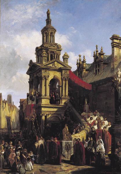 scène (procession, foule, reliquaire, statue : saint Romain de Rouen, captif, église, rue, Rouen)