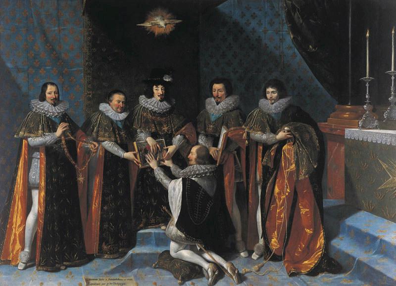 Commandé par le roi pour orner la chapelle du Saint-Esprit de l'église des grands Augustins. Ce tableau montre le roi, au centre, en costume de Grand Maître de l'Ordre, recevant le serment de fidélité d'Henri II d'Orléans. Louis XIII est entouré de Claude Bartillier, grand trésorier de l'Ordre, du chancelier Claude de Bullion, du greffier du Saint-Esprit Charles Duret et du prévôt maître de cérémonie Michel de Beauclerc. Au-dessus du roi est figurée la colombe symbolique, les ailes étendues dans une auréole. La richesse des décors et des costumes participe à la solennité de la scène. Les revers jaunes orangés des manteaux de l'Ordre apportent des touches colorées. Celui destiné à Henri d'Orléans, porté par Michel de Beauclerc sur l'envers, qui lance des reflets flamboyants. La dignité simple des attitudes s'accompagne de portraits qui témoignent d'une grande attention psychologique. Aucun de ces personnages conscients de leur importance, hormis peut-être le chancelier Claude de Bullion, n'accorde le moindre regard au nouveau venu dans l'Ordre ; en rapport avec : Réception d'Henri d'Orléans, duc de Longueville
