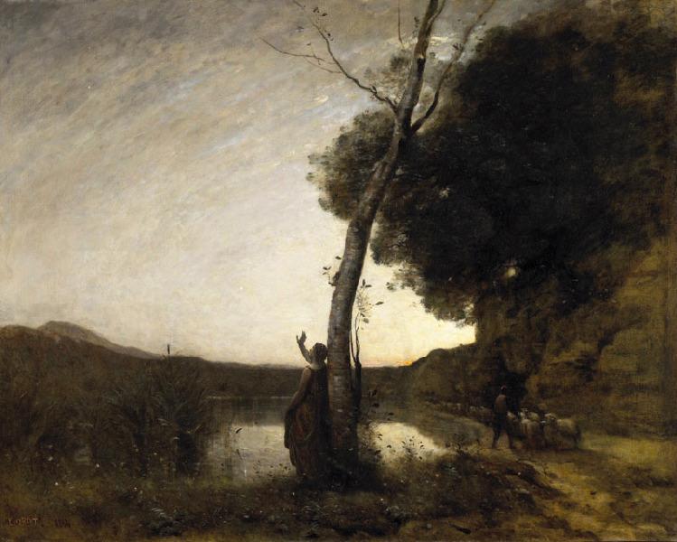 Camille Corot aujourd'hui universellement reconnu, reçut dans sa jeunesse une solide formation académique tout en faisant ses premières expériences de peinture en plein air. Ce sont certainement ses fréquents voyages en France comme en Italie qui ont fait naître chez lui ce goût pour la peinture de paysage qu'il ne va cesser de multiplier tout au long de sa carrière. Dans cette oeuvre tardive, c'est un paysage recomposé à partir de ses souvenirs et de ses impressions qui donne le ton de la scène. Corot a volontairement laissé dans sa toile une large place au ciel, ce qui lui a permis de travailler sur son domaine favori : la lumière. Par une savante juxtaposition de touches légères qui se déclinent dans des gris argentés plus ou moins lumineux, il a parfaitement réussi à révéler l'atmosphère d'une aube naissante qui vient se refléter dans une étendue d'eau au deuxième plan. Une femme drapée à l'antique, selon le modèle académique, invoque de la main l'étoile du matin près d'un arbre dépouillé. Non loin, un berger semble s'éloigner avec son troupeau. Ces éléments habilement réunis donnent à cette scène une ambiance de sérénité mais également d'isolement dans laquelle le spectateur peut se sentir entraîné. Il s'agit là d'une belle ambiance de rêve poétique que l'on peut retrouver dans une autre de ses oeuvres ' Souvenir de Mortefontaine ' (1864) ; en rapport avec : L'étoile du matin