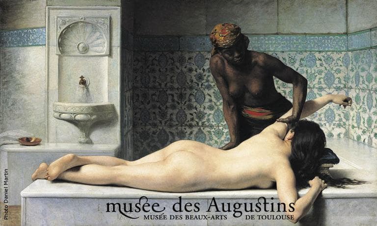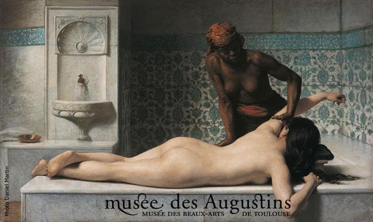 Cette scène de hammam illustre la grande vogue orientaliste du XIXe siècle. Debat-Ponsan a exécuté cette toile juste un an après un voyage qu'il avait effectué en Orient comme le montre la précision de certains détails de sa composition. Le moment du massage, ici évoqué, est une étape des soins du corps pratiqués dans ce type de lieu. Une baigneuse, incarnée par une femme blanche est allongée sur une marche de marbre gris ; une femme noire à demi vêtue et coiffée d'une sorte de turban tire sur son bras gauche. Tout comme dans les scènes de hammam de Gérome, Debat-Ponsan insiste sur le contraste entre le corps du modèle noir qui apparaît tendu, rude et musculeux, évoquant le labeur quotidien, et celui de la baigneuse au modelé doux, à la peau laiteuse et à la position alanguie. Il ne faut pas oublier que cette scène exotique n'est qu'un habile prétexte servant à peindre un nu érotique en toute impunité où la femme blanche prend un caractère idéalisé.