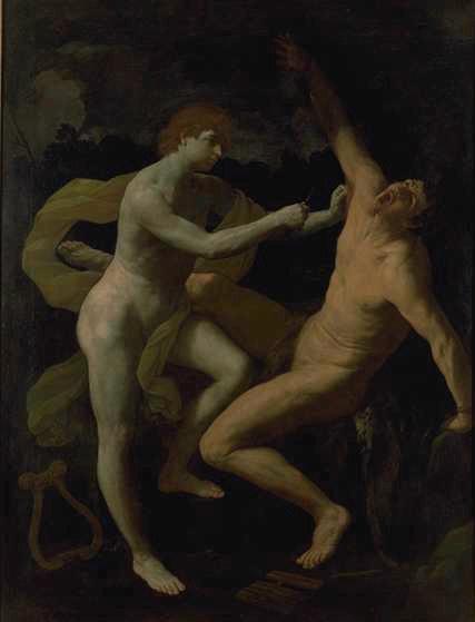provient du Palais royal de la Galerie des ducs de Savoie de Turin. Suivant l'impulsion donnée par les Carrache, Guido Reni rejette l'abstraction maniériste de la fin du XVIe siècle, et célèbre dans ses toiles le culte de la beauté, en excluant de ses tableaux toute laideur et toute vulgarité. Dans cette scène issue de l'Antiquité grecque, Apollon écorche Marsyas pour l'avoir défié à la flûte. Malgré l'horreur de la scène, Guido Reni reste fidèle à son idéal de beauté et de perfection. Il construit une composition basée sur une opposition totale entre les deux personnages : la coloration blanche de la divinité contraste avec la carnation dorée de Marsyas. Par ailleurs, Apollon, comme beaucoup des sujets les plus cruels de Guido Reni, affiche une sérénité qui ne fait que mieux ressortir le visage contracté par la douleur et le corps renversé de Marsyas. Cette carnation très blanche d'Apollon, qui lui donne une dimension immatérielle, a souvent été mal comprise, et on a dit de son personnage qu'il n'était qu'ébauché ou inachevé (Catalogue Lucas, 1806, p.28).
