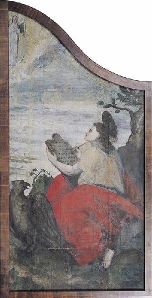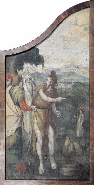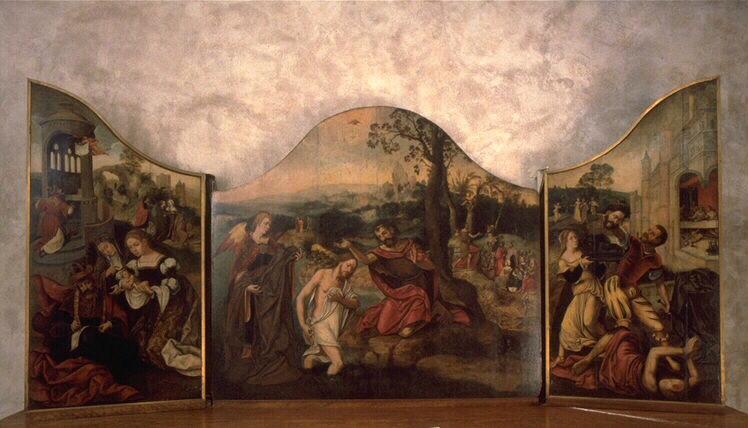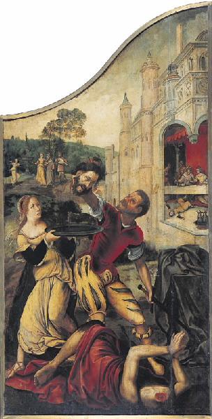 scène biblique (cycle narratif, sainte Elisabeth de Jérusalem) ; scène biblique (saint Zacharie, apparition, ange) ; scène biblique (rencontre, sainte Elisabeth de Jérusalem, Vierge) ; scène biblique (sainte, ?, sainte Elisabeth de Jérusalem, présentation, saint Jean-Baptiste, nourrisson, saint Zacharie, écriture) ; fond de paysage ; scène biblique (cycle narratif, saint Jean-Baptiste) ; scène biblique (Baptême du Christ) ; scène biblique (saint Jean-Baptiste, prédication, famille, arbre) ; scène biblique (saint Jean-Baptiste, reproche, Hérode, Hérodiade, Salomé) ; Dieu le Père (en buste, apparition) ; Saint-Esprit (colombe) ; fond de paysage ; scène biblique (cycle narratif, saint Jean-Baptiste) ; scène biblique (danse, Salomé) ; scène biblique (saint Jean-Baptiste, peine de mort, décollation, bourreau, Salomé, plat) ; scène biblique (Hérode, Hérodiade, succès, table, palais, intérieur) ; fond de paysage
