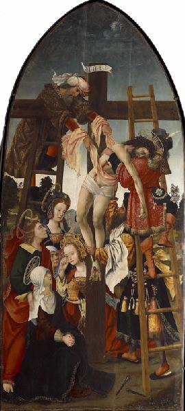 scène biblique (Descente de Croix, saint Joseph d'Arimathie, sainte Madeleine, saint Nicodème, échelle, saint Jean, sainte Marie Cléophas, sainte Marie Salomé, sainte Madeleine, vêtement, récipient : orfèvrerie)