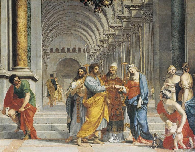 Ce tableau est un modèle pour la troisième des quatorze pièces de la tenture de la Vie de la Vierge commandée par le chanoine le Masle pour Notre-Dame de Paris, mais conservée depuis 1739 à la cathédrale de Strasbourg. Carton 6 de tapisserie commandé pour la tenture de la vie de la Vierge, renvoyé de Bruxelles à Paris avant le 9 décembre 1650. Déposé dans la salle capitulaire de Notre-Dame de Paris au XVIIe siècle. En rapport avec : Mariage de la Vierge, Mariage de la Vierge, La naissance de la Vierge, La présentation de la Vierge au temple, Les noces de Cana, L'annonciation