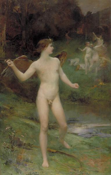 scène mythologique (Eros, jeune homme, nu, flèche, relation bienveillante, danse, jeune fille, nu)
