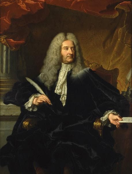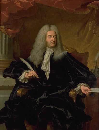 Nouvelle iconographie donnée par Stephan Perreau en 2011 et par Ariane James-Sarazin en 2012. Michel Robert Le Peletier des Forts (1675-1740), comte de Saint-Fargeau, Contrôleur Général de 1726 à 1730. Longtemps considéré comme un portrait de Jean Racine, pourtant mort en 1699, puis Germain-Louis de Chauvelin, marquis de Grobois (1685-1762), personnage considérable qui fut notamment Garde des Sceaux en 1727, avant d'être nommé Secrétaire d'Etat aux Affaires Etrangères. Rigaud représente son portrait dans un costume de premier magistrat de France, dans une attitude très solennelle, avec des traits immobiles, un regard sérieux fixant un interlocuteur invisible, et un air quelque peu hautain. Drapé de noir, il est assis dans un fauteuil de bois doré, et tient un pli portant l'adresse Au Roy. Le peintre, par ce procédé, témoigne de l'importance du personnage. La masse sombre du manteau noir est éclairée par des reflets de lumière qui soulignent les plis du tissu. Dans ce tableau sont résumés les talents du spécialiste de la peinture de cour qu'est alors Hyacinthe Rigaud : son personnage est présenté dans une attitude empreinte de noblesse et dans un décor somptueux de riches velours qui dissimulent en partie une colonne cannelée. Nous nous trouvons ici devant un exemple type du portrait d'apparat, particulièrement apprécié durant le Grand Siècle. En rapport avec : Portrait de Michel Robert Le Peletier des Forts