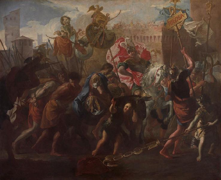scène (Théodoric Ier, triomphe, cavalier, Litorius comte, captif, trophée de guerre, enseigne militaire, rempart, Toulouse)