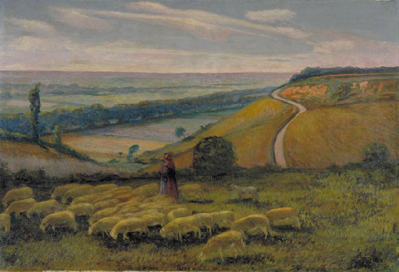 paysage (prairie, colline, bergère, femme, champ, berger, homme, mouton)