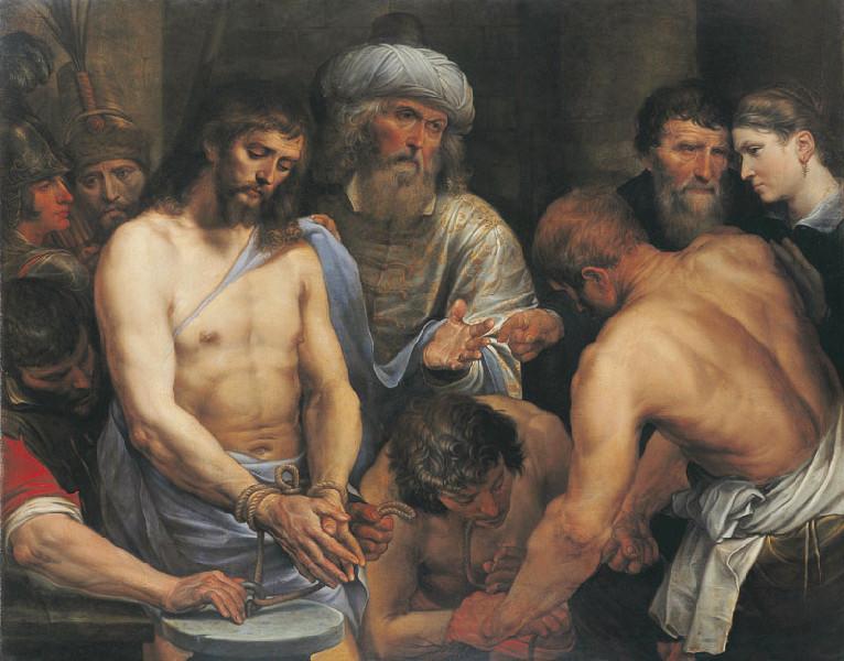 scène biblique (Ecce homo : Jésus présenté au peuple, lien, bourreau, soldat, Pilate, homme, femme, tristesse) ; bourreau (lien : fouet)