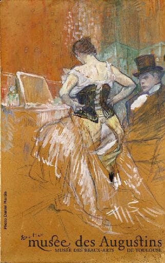 Cette étude préparatoire a servi pour une lithographie portant le titre plus complet de ' Femme en corset, conquête de passage '. Elle faisait partie d'un album de onze lithographies en couleurs qui constituaient une série sur la vie intime des courtisanes - un des sujets de prédilection de l'artiste qui connaissait bien ce monde là. Une silhouette féminine vue de trois-quarts dos, au corps un peu appesanti, essaie de lacer son corset devant sa table de toilette. Elle occupe le centre de la composition et relègue le personnage masculin sur le bord du dessin dont il sort quasiment. Le modelé du buste de la jeune femme - objet de la convoitise - est rendu avec précision alors que son jupon n'est que suggéré à l'aide de larges coups de craie et de pinceau. De la même façon, seul le visage de l'homme est suffisamment abouti et son regard semble suivre avec intérêt les moindres gestes de la femme. Les rehauts de couleurs par endroits ont permis à l'artiste d'insister sur les détails les plus importants. Cette étude montre également clairement les hésitations de Toulouse-Lautrec dans le choix du décor. La singularité de cette oeuvre réside dans l'introduction d'un personnage masculin qui n'apparaîtra plus dans les autres lithographies de cet album.