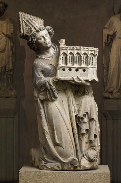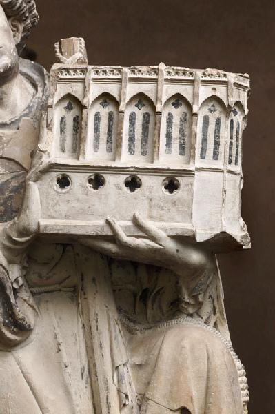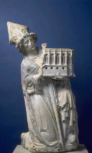 Le genou droit à terre, l'évêque Jean Tissendier présente la maquette de la chapelle de Rieux détruite au XIXe siècle. Le prélat méridional en se faisant représenter comme un mécène moderne, nous transmet l'image de ce bâtiment qui correspond aux relevés cadastraux effectués par Saget au XVIIIe siècle. L'expression douce et calme du visage de l'évêque est rendue grâce à un épiderme de pierre modelé avec finesse, reflétant la vérité psychologique de ce personnage mitré et vêtu du costume des franciscains. Cette statue, probablement réalisée avant la mort de Jean Tissendier est de la première moitié du XIVe siècle.