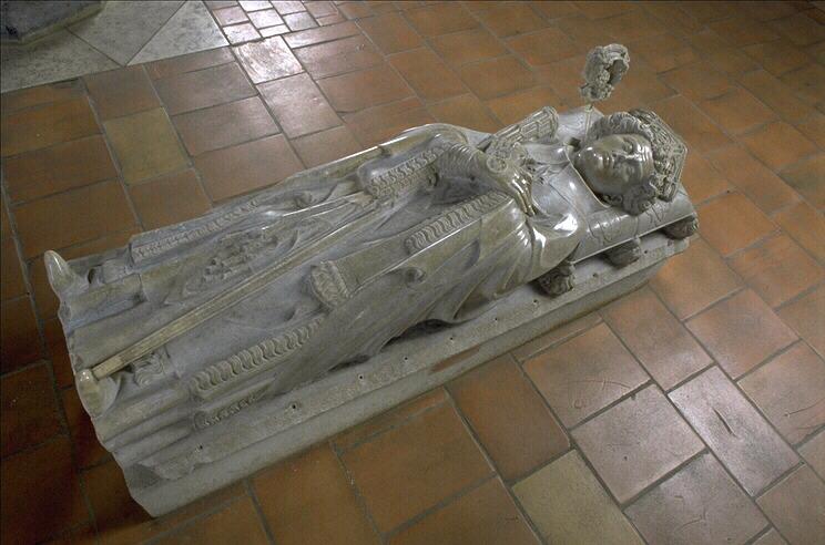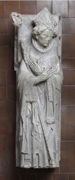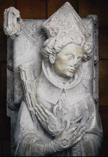 figure (Tissendier Jean, homme, allongé, sur le dos, cheveux, chape, chasuble, manteau, tunique, crosse, mitre, gant, bijou, évêque) ; coussin (écu, en médaillon) ; armoiries (croissant de lune, coquille Saint-Jacques)