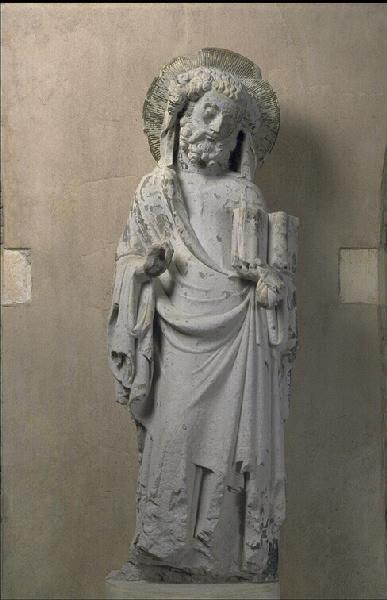 figure biblique (Apôtre, homme, en pied, auréole, cheveux, barbe, manteau, tunique, présentation, livre)