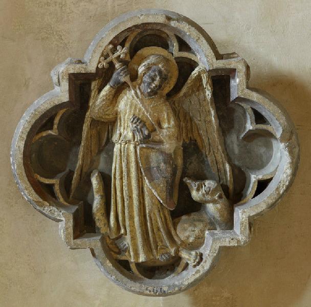 scène biblique (foulant aux pieds, saint Michel, en pied, écu, croix, Lucifer, dragon) ; croix (fleuron) ; ornementation (rosace orn)