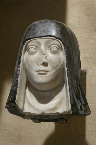 Tête féminine acquise en 1844 à la demande d'Alexandre Du Mège par la Société d'Archéologie du midi de la France qui en fit don au musée. Les éléments du costume et l'utilisation du marbre blanc et noir suggère les éléments de la coiffe d'une religieuse. Cette sculpture peut être rapprochée de la statue de Marie de Bourbon, prieure des dominicaines de Saint-Louis de Poissy, conservée au musée du Louvre.