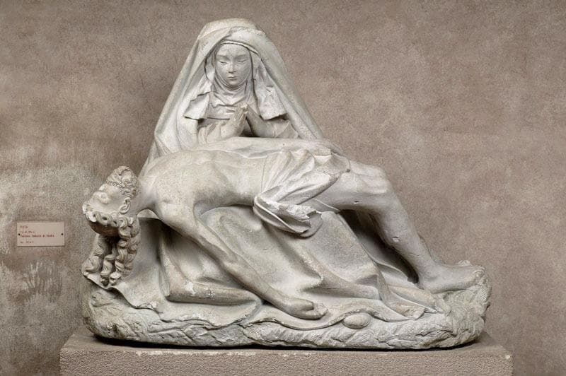 Selon Roger Camboulives, cette Pietà proviendrait de l'ancienne église de Candie, paroisse du vieux village de Toulouse (actuellement commune de Toulouse). Après son abandon en 1775 cette église fut détruite.