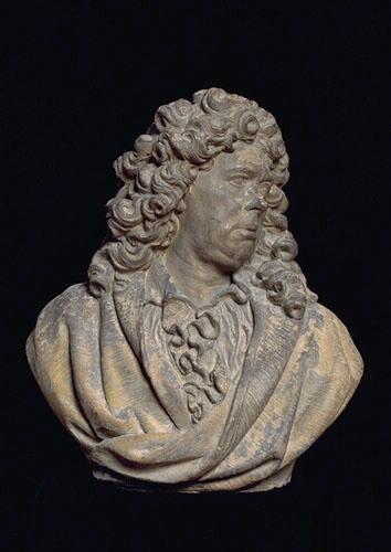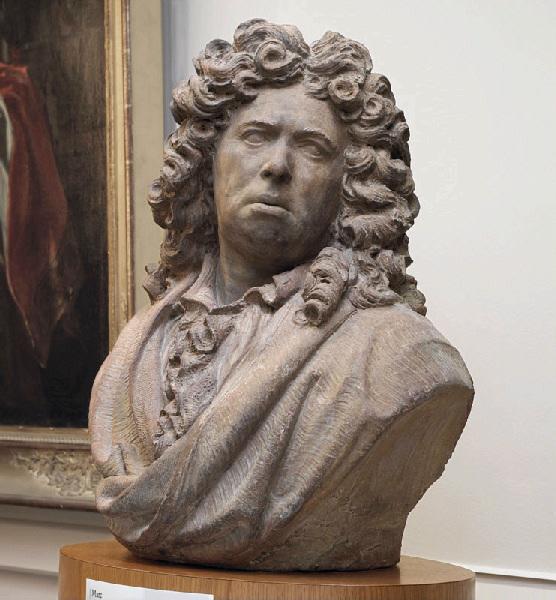 le visage est tourné vers la gauche. La perruque est abondante et tombe sur les épaules. Draperies se croisant sur le torse, laissant apparaître le jabot de la chemise.