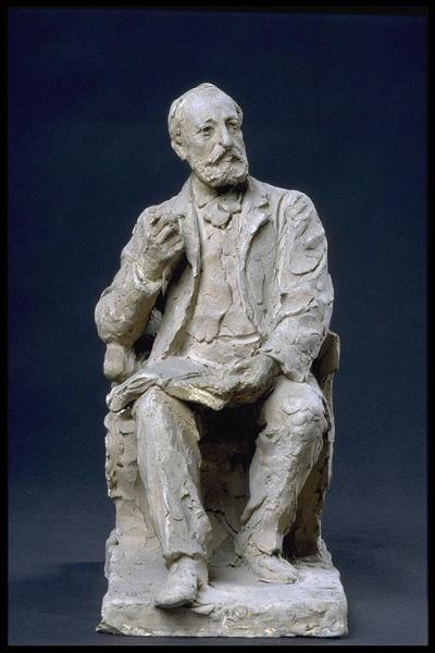portrait (Saint-Saëns Camille, compositeur, musicien, homme, assis, habit, feuillet, instrument d'écriture, fauteuil)