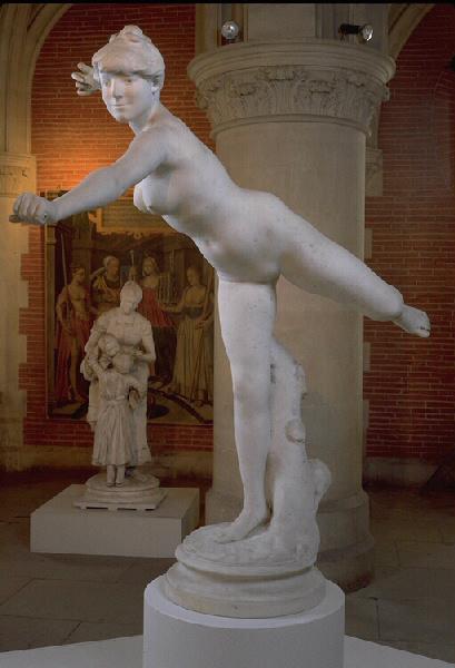 figure mythologique (nymphe, femme, sourire, nu, penché, extension, en équilibre, chasse à tir, tronc)