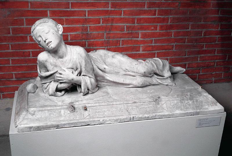 figure (Tarcisius, colombe, martyre, religion chrétienne, pierre, garçon, tunique, chaussure, couché sur le côté, expression du visage, douleur, lapidation) ; ornementation (Chrisme, croix, couronne, vase, cartouche orn)