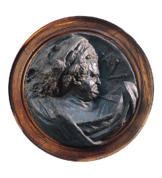 Buste dont la tête, laurée et tournée à gauche, est coiffée d'un mufle de lion. Entre le profil et l'orle, les lettres A. V. en relief.