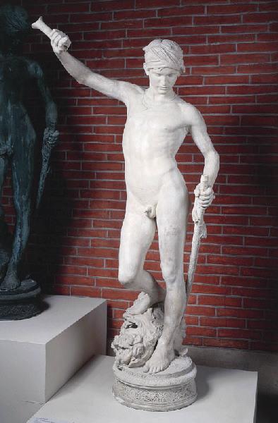 figure biblique (David, jeune homme, nu, coiffe, en pied, tête : Goliath, épée)