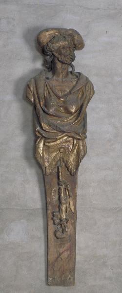 figure (allégorie : colère, torche, femme : vieille, en buste, à mi-corps, draperie, effet de tissu, cheveux, coussin) ; couteau