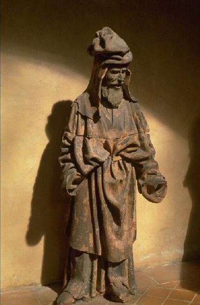 figure (homme, en pied, barbe, couvre-chef, tunique, manteau, ceinture, chaussure, expression du visage)