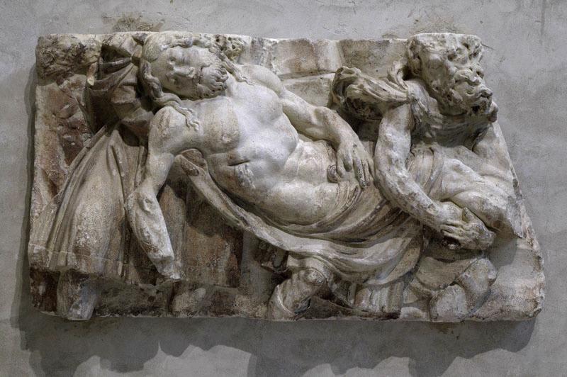 Bachelier fut à l'origine de l'essor de la Renaissance à Toulouse. Il participa à la décoration de nombreux édifices religieux comme ceux de la Daurade, de la Dalbade, des Jacobins ou des Cordeliers. L'emplacement d'origine de ce fragment de bas-relief reste incertain, on suppose qu'il vient du couvent des Cordeliers où Bachelier avait effectivement exécuté une clôture de choeur avec des bas-reliefs. Ce fragment très incomplet présente deux personnages en marche portant le corps du Christ mort. De celui de gauche on ne voit qu'une partie de la tunique, de celui de droite, qu'une tête barbue tronquée et une partie des bras qui soutiennent les jambes du Christ. Celles-ci et sa main droite sont amputées. Malgré ces nombreuses mutilations, cette composition reste équilibrée et d'une grande qualité. Le modelé des corps et le rendu des drapés sont les témoins de la grande habileté d'exécution de l'artiste, et les visages très expressifs contribuent à souligner l'intensité dramatique de la scène.