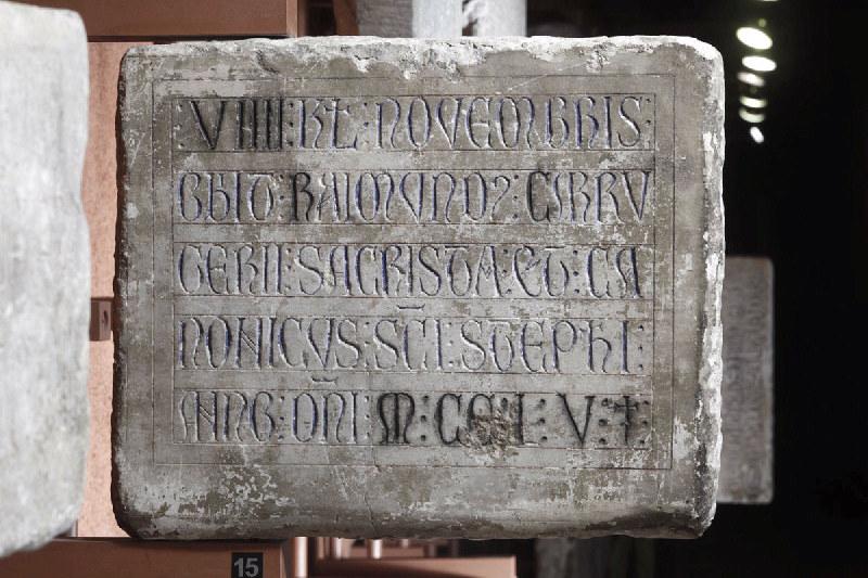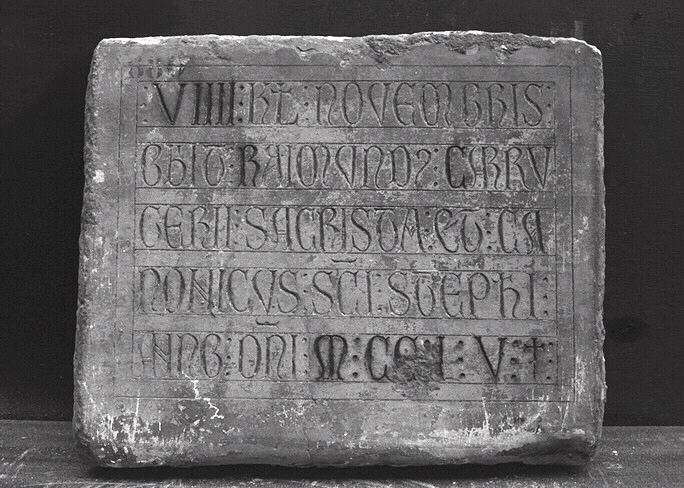 épitaphe : traduction : 'Le 9 des calendes de novembre mourut Raymond Carrugier, sacristain et chanoine de l'église Saint-Etienne, l'an du Seigneur 1255.'