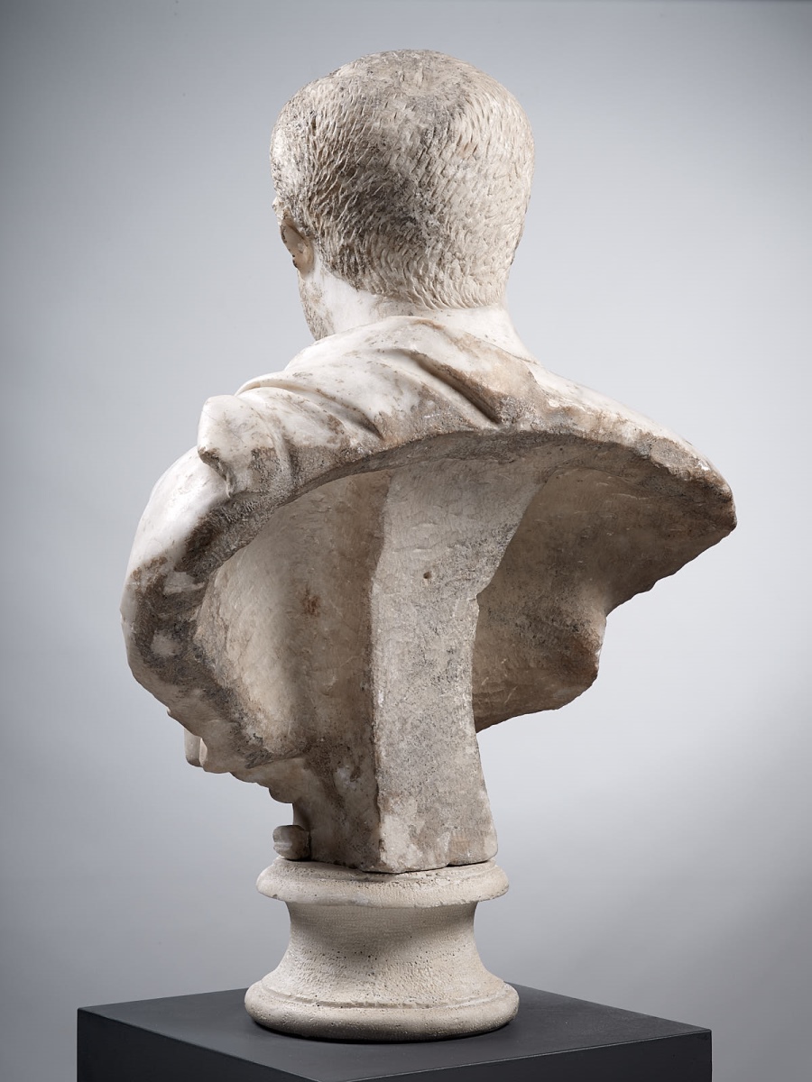 Après l'assassinat d'Alexandre Sévère, le siècle sera marqué par une guerre civile presque continue. Des généraux sont alors élevés à la tête de l'Empire par les armées. Tous ces empereurs règnent peu de temps et finissent par être assassiné par leurs successeur. Cette période fut nommée « Anarchie militaire ». Cette oeuvre rappelle le style adopté pour les portraits sculptés des empereurs militaires Maximin le Thrace (235-238) et Gordien I (238). La chevelure aux mèches très courtes caractérise elle aussi l'art du portrait de cette époque. La poitrine dénudée occupe une grande place, le regard est expressif grâce à l'iris gravé et aux pupilles marquées par un point double. Pascal Capus, 2015.