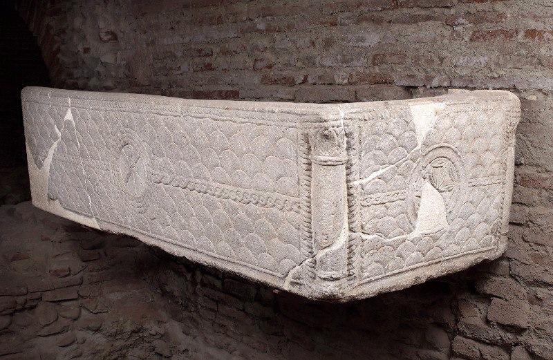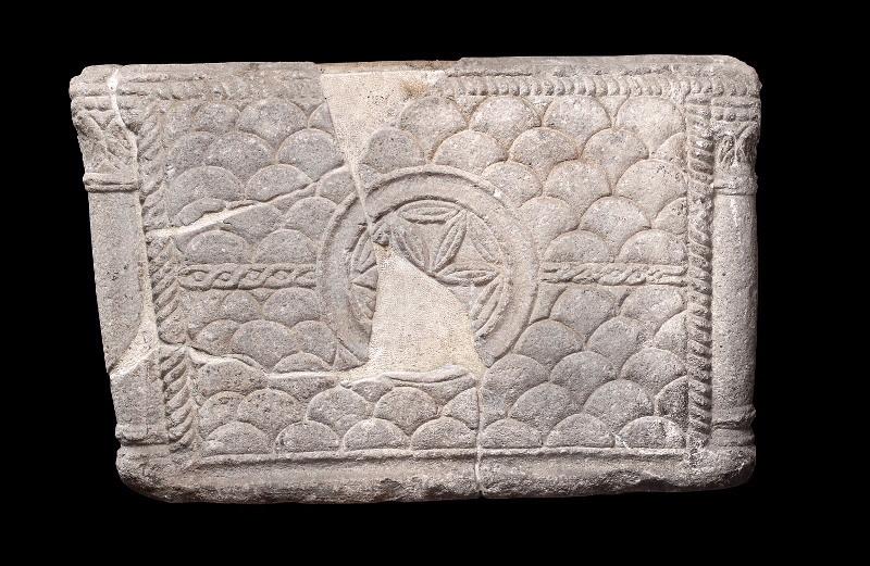 Cuve de sarcophage ornée d'un chrisme et d'imbrications tournées vers le haut.