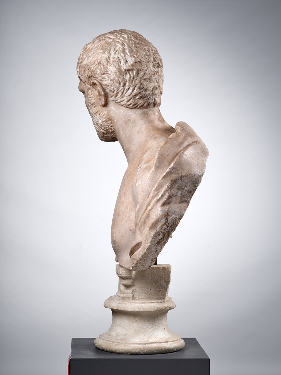 Si la partie basse de ce buste est brisée, ce portrait n'en demeure pas moins monumental. Le grand manteau (pallium) rejeté vers l'arrière, qui valorise la large poitrine, caractérise habituellement le philosophe ou l'homme de lettres de la tradition grecque. Depuis les années 120-130 et le règne d'Hadrien, les juristes, rhéteurs (qui enseignaient l'art oratoire) et savants furent de plus en plus nombreux à être nommés procurateurs. Serait-ce ici l'un des hauts fonctionnaires qui géraient notamment le patrimoine de l'empereur ? Pascal Capus, 2015. ; Marbre de Göktepe (Turquie) Si la partie basse de ce buste est brisée, ce portrait n'en demeure pas moins monumental. Le grand manteau (pallium) rejeté vers l'arrière, qui valorise la large poitrine, caractérise habituellement le philosophe ou l'homme de lettres de la tradition grecque. Depuis les années 120-130 et le règne d'Hadrien, les juristes, rhéteurs (qui enseignaient l'art oratoire) et savants furent de plus en plus nombreux à être nommés procurateurs. Serait-ce ici l'un des hauts fonctionnaires qui géraient notamment le patrimoine de l'empereur ? ; De grandes dimensions et presque intact, ce buste était très développé vers le bas, où il a été brisé. La naissance et le volume des bras sont prononcés. Cela accentue la présence de la poitrine et des épaules nues que ne recouvre qu'en partie un manteau rejeté vers le dos. Ce détail vestimentaire fait penser à la représentation d'un philosophe, d'un homme de lettres ou d'un rhéteur. Le nez, cassé, montre son attache rectifiée par une restauration du XIXe siècle. Les rides du front renforcent la gravité de l'expression. La coupe du visage et le type de coiffure évoquent déjà les portraits de Caracalla. Le travail de la chevelure et de la barbe permet également de situer l'oeuvre dans le temps. Les mèches et touffes de poils sont comme déchiquetées, criblées de trous de trépan vers l'avant, ou bien plus hâtivement indiquées par des incisions irrégulières vers l'arrière. On reconnaît là une technique fréquemment employée sous le règne de Septime Sévère (193-211) et sous celui de Caracalla (211-217).