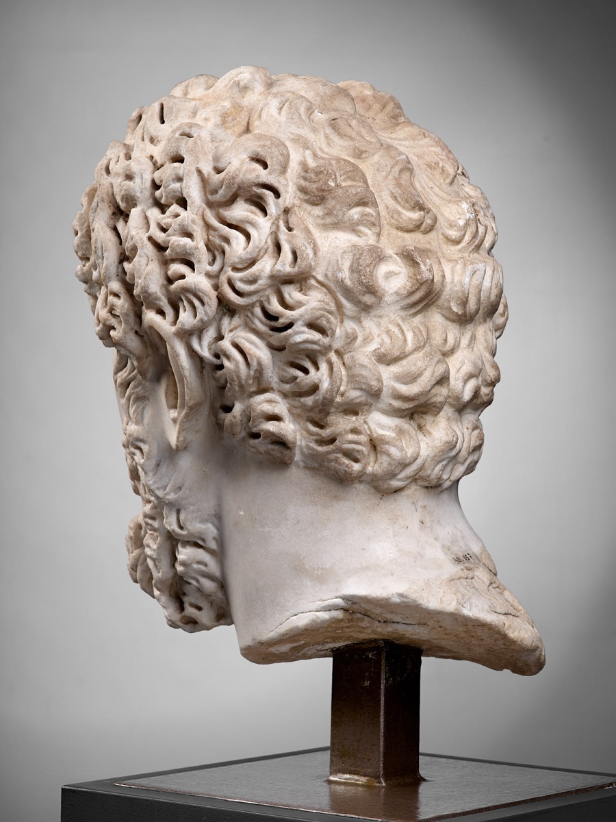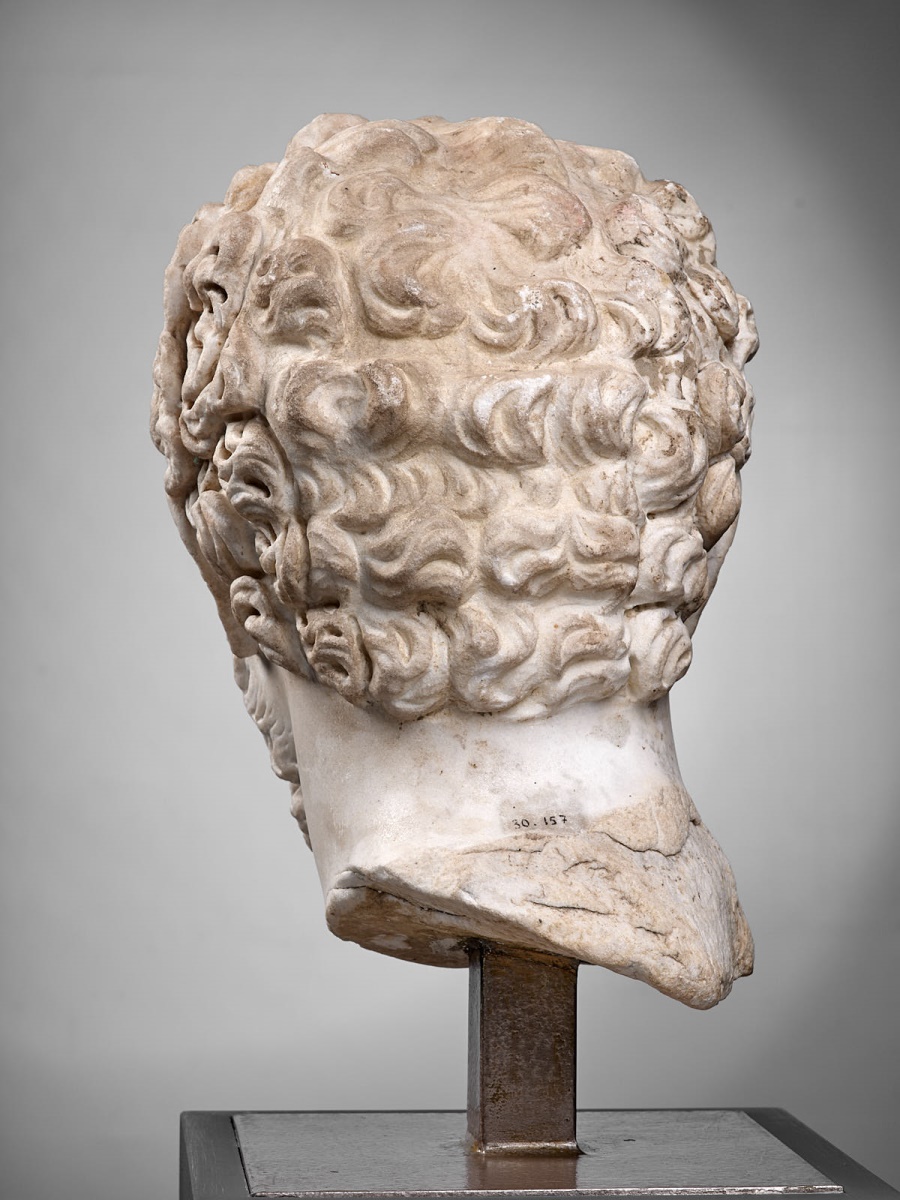 Sénateur d'origine africaine, né à Leptis Magna (en Tripolitaine, actuelle Libye), Septime Sévère devient gouverneur de la province de Pannonie supérieure, au coeur de l'Europe. Suite à l'assassinat de l'empereur Commode, puis de celui de Pertinax, il est fait empereur par les légions du Danube. Il s'appuie sur ses armées et entreprend une marche sur Rome afin d'être légitimé et éliminer ses principaux rivaux. Cette tête de grande qualité, conçue dans un atelier officiel de Rome, date de cette accession au pouvoir, en 193. Septime Sévère, avait alors 38 ans. Coiffure et barbe courtes, trois mèches rondes sur le front, regard dirigé vers le haut et rotation de la tête vers la droite sont très proches de la tête des musées du Capitole, à Rome. Ce portrait de Chiragan semble provenir du même atelier que celui du musée de l'Ermitage, à Saint-Pétersbourg. Il rappelle par son style les derniers portraits de Commode mais ressemble également à ceux d'Antonin le Pieux. Septime Sévère cherche, en effet, à justifier par l'image une filiation totalement artificielle avec la précédente dynastie des Antonins. Pascal Capus, 2015 ; Septime Sévère (146 - 211) Empereur de 193 à 211. Type dit « de l'avènement ». Marbre de Göktepe (Turquie). Sénateur d'origine africaine, né à Leptis Magna (en Tripolitaine, actuelle Libye), Septime Sévère devient gouverneur de la province de Pannonie supérieure, au coeur de l'Europe. Suite à l'assassinat de l'empereur Commode, puis de celui de Pertinax, il est fait empereur par les légions du Danube. Il s'appuie sur ses armées et entreprend une marche sur Rome afin d'être légitimé et éliminer ses principaux rivaux. Cette tête de grande qualité, conçue dans un atelier officiel de Rome, date de cette accession au pouvoir, en 193. Septime Sévère, avait alors 38 ans. Coiffure et barbe courtes, trois mèches rondes sur le front, regard dirigé vers le haut et rotation de la tête vers la droite sont très proches de la tête des musées du Capitole, à Rome. Ce portrait de Chiragan semble provenir du même atelier que celui du musée de l'Ermitage, à Saint-Pétersbourg. Il rappelle par son style les derniers portraits de Commode mais ressemble également à ceux d'Antonin le Pieux. Septime Sévère cherche, en effet, à justifier par l'image une filiation totalement artificielle avec la précédente dynastie des Antonins. ; La tête légèrement tournée vers la droite, le regard dirigé dans le même sens, la chevelure et la barbe relativement courtes encore, les oreilles découvertes, ce portrait est celui d'un homme d'action. Il a parfois passé pour celui d'un simple particulier mais s'inscrit pourtant sans conteste dans l'iconographie impériale officielle : il appartient en effet au premier type, dit aussi "type de l'avènement", de Septime Sévère. Plusieurs répliques conservent la trace de l'original, créé en effet au moment de l'avènement comme le montrent les émissions monétaires. Stylistiquement, on soulignera le caractère commodéen de cette première image de l'empereur. On notera aussi ce qui, de profil, aide à le distinguer des portraits de son collège Clodius Albinus, co-régent pendant les campagnes orientales (il est nommé Caesar dès 193) puis concurrent direct, défait près de Lyon en février 197, que l'on a trop souvent confondu avec lui. [Jean Charles Balty]