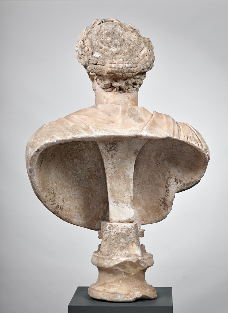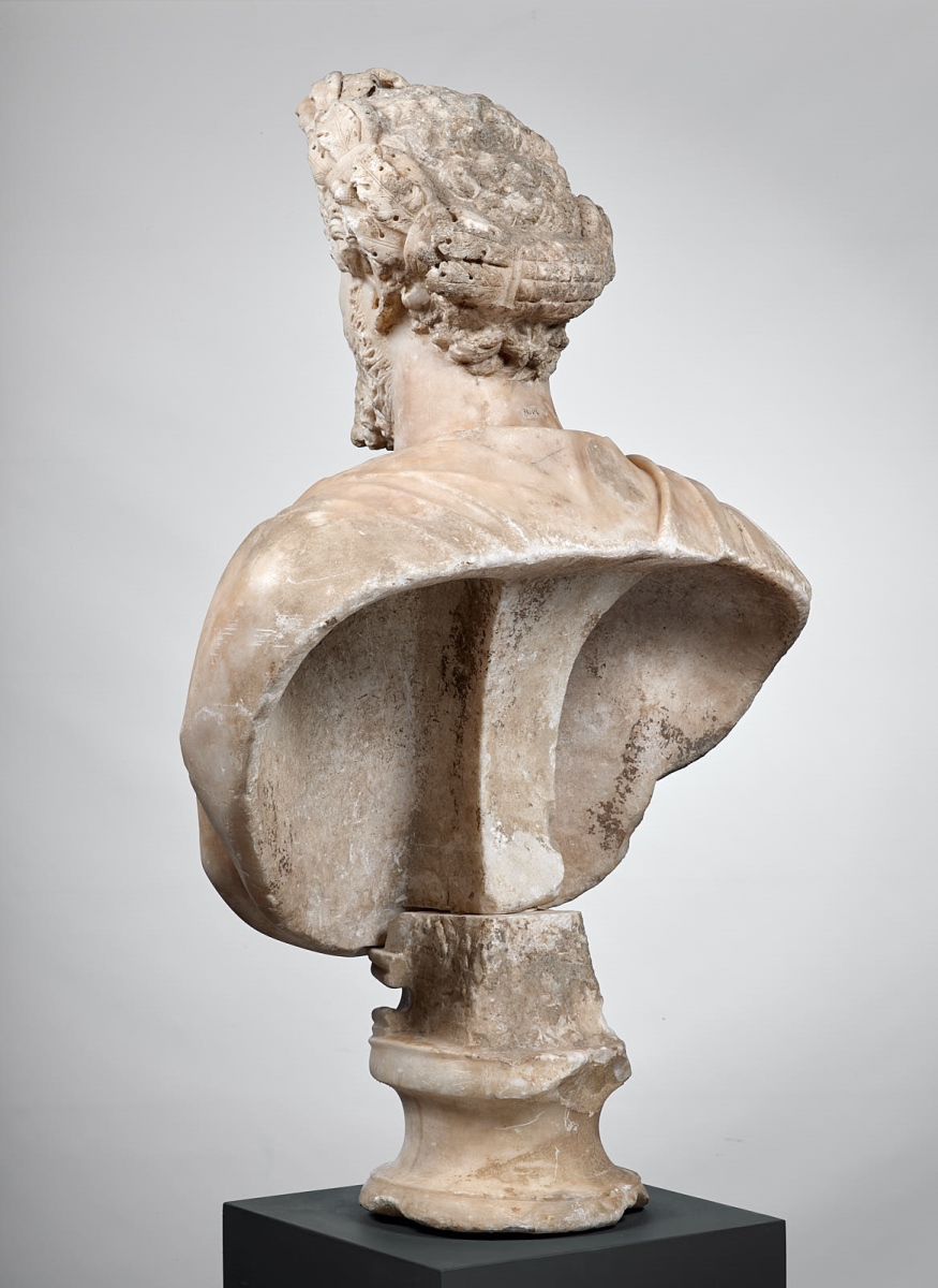 La cuirasse de cet imposant buste est couverte d'un paludamentum (grand manteau impérial), retenu par une fibule sur l'épaule. Les quatre longues boucles, parallèles, sur le front, se rapprochent de celles du dieu sauveur gréco-égyptien Sérapis. On a tenté d'expliquer cette coiffure particulière par le voyage en Égypte de l'empereur et de sa famille, en 199. Ces mèches frontales feraient-elles ainsi allusion au sauveur ou au nouvel instaurateur de paix, que représentait l'empereur ? La grande et rare couronne civique rappelle, comme ce fut le cas pour Auguste en 27 avant notre ère, que Septime avait, lui aussi, mis fin à une guerre civile, celle des années 193-197, qui avait suivi l'assassinat de Commode. Pascal Capus, 2015. ; Le siècle des Antonins s’achève en 192 avec l’assassinat de l’empereur Commode. Après les courts règnes de Pertinax et de Didius Julianus, Septime Sévère inaugure une nouvelle dynastie. Originaire de Leptis Magna, en Afrique romaine, il favorisera tout particulièrement cette cité, considérablement restructurée dans son urbanisme et parée de monuments fastueux. Septime Sévère, l’Africain, est décrit comme un individu petit, au cheveu frisé et au fort accent punique. Il épouse en seconde noce Julia Domna, fille d’un grand prêtre du dieu Baal d’Emèse, en Syrie (actuelle Homs). Avec l’impératrice et sa cour, l’Orient pénètre ouvertement à Rome et dans la religion, les coutumes et la mode vestimentaire en sont profondément marquées. Leurs deux fils, Lucius Septimus Bassianus (surnommé Caracalla) et Lucius Septimus Geta, destinés à régner conjointement, seront séparés par la jalousie et la mort du second, assassiné par son propre frère. Les portraits de ces deux enfants sont d'ailleurs présentés à proximité de ce buste de Septime Sévère. Les portraits de Septime Sévère reprennent des caractéristiques de ceux de la dynastie précédente. Il cherche ainsi à se légitimer. Ce grand buste couronné de chêne est l’un des quatre portraits de cet empereur découverts à Chiragan. Drapé dans le paludamentun, le grand manteau des généraux, Septime arbore surtout, à l’image du portrait d’Auguste, la couronne de chêne dite couronne civique. Par cette référence, il se pose comme le nouveau Sauveur de l’État. Cette qualité est peut-être confirmée par les quatre mèches verticales qui se détachent sur le front. Elles seraient une assimilation ou un hommage au dieu gréco-égyptien Sérapis, souvent représenté avec cet attribut capillaire qui symbolise le renouveau et dans le temple duquel l’empereur s’était rendu lors de son voyage en égypte. Parallèlement, vers 200, les monnaies confirment cette association de Septime Sévère au dieu du Delta du Nil. ; Septime Sévère (146 - 211) Empereur de 193 à 211 Type « Sérapis » Marbre d'Afyon (Turquie) La cuirasse de cet imposant buste est couverte d'un paludamentum (grand manteau impérial), retenu par une fibule sur l'épaule. Les quatre longues boucles, parallèles, sur le front, se rapprochent de celles du dieu sauveur gréco-égyptien Sérapis. On a tenté d'expliquer cette coiffure particulière par le voyage en Égypte de l'empereur et de sa famille, en 199. Ces mèches frontales feraient-elles ainsi allusion au sauveur ou au nouvel instaurateur de paix, que représentait l'empereur ? La grande et rare couronne civique rappelle, comme ce fut le cas pour Auguste en 27 avant notre ère, que Septime avait, lui aussi, mis fin à une guerre civile, celle des années 193-197, qui avait suivi l'assassinat de Commode. ; Le portrait appartient au "type Sérapis" des effigies de Septime Sévère, qui paraît dater des années 200/201 et sera très largement diffusé durant la seconde décennie du règne. La dénomination est de H.P. L'Orange, qui, étudiant, dans un ouvrage devenu célèbre (Apotheosis in Ancient Portraiture, Oslo, 1947), les processus de divinisation de l'empereur par l'image, avait noté l'étroit parallélisme existant entre ces Septime Sévère et l'image de Sérapis - dont les quatre mèches tire-bouchonnées de la frange frontale sont ici reprises. Cette thèse a parfois été combattue, aucune émission monétaire par exemple ne justifiant semblable assimilation iconographique (alors même qu'Hercule, Bacchus ou Jupiter apparaissent en revanche avec une certaine récurrence) ; mais le nom est resté, qui rend commodément compte, il faut bien l'avouer, du détail le plus caractéristique de ce type. C'est donc lui que l'on conservera, jusqu'à plus ample informé. Y verra-t-on, à l'image même du dieu alexandrin, le manifeste d'un empereur-sauveur, restitutor Urbis et fundator Pacis (McCann, 1968, p. 69), ou un hommage particulier rendu à un dieu de salut, ainsi qu'il se faisait assez couramment depuis plus d'un siècle ? On ne peut en décider. Ce buste est particulièrement imposant par l'ampleur du torse cuirassé, revêtu du paludamentum. La couronne civique renvoie à celui qui a su rétablir l'ordre dans l'Etat et la concorde entre les citoyens au terme d'une guerre civile. Les événements de 193-197 sont encore bien présents, on le voit, dans la thématique de l'oeuvre. (Jean-Charles Balty)