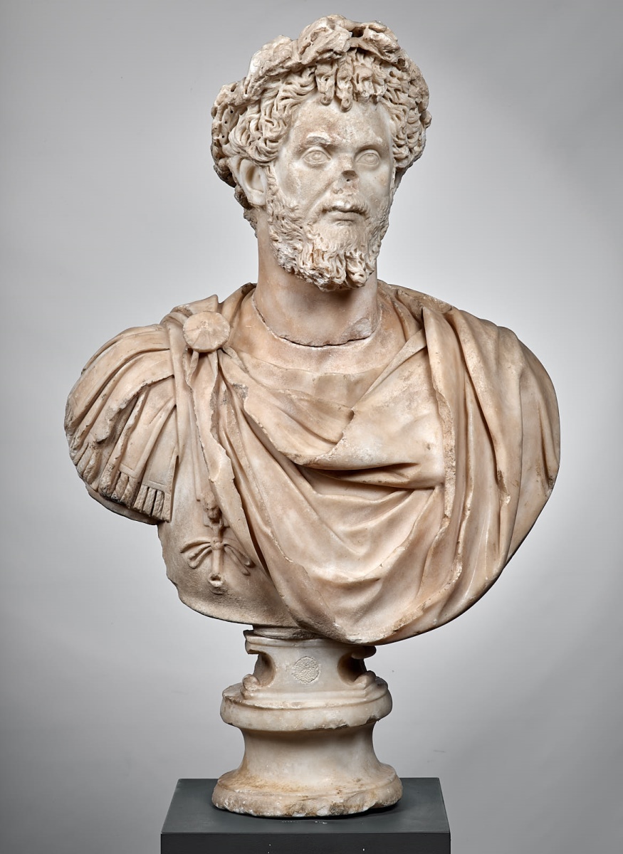 (Septime Sévère, paludamentum, fibule, couronne civique, barbe, buste)