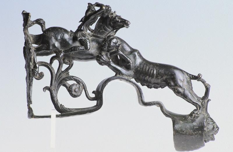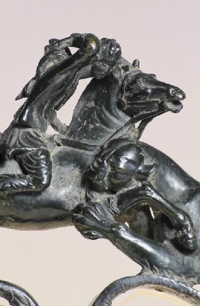 Dans ce décor, une panthère attaque un cavalier. Toute la musculature du fauve est tendue dans sa rage de vaincre, les crocs plantés à pleine gueule dans le poitrail du cheval dont il maintient les cuisses dans ses énormes griffes. La victime hennit de douleur, tandis que le cavalier lève la main droite pour frapper de son glaive la tête de l'attaquant. La scène nous apparaît ainsi saisissante de vérité, comme un instantané photographique. Toutefois, la violence du choc frontal est accentuée par la position très allongée du fauve, démesurément disproportionné par rapport à sa proie, tandis que l'homme et sa monture sont comme suspendus au-dessus de leur agresseur. Si cheval et cavalier sont en harmonie de proportions, ils paraissent cependant tassés dans la partie supérieure du support. La courbe du fleuron qui soutient le ventre du cheval est reprise par le corps de l'homme. La tête de ce dernier et celle de l'animal referment ainsi le carré formé par la partie inférieure droite du montant. La panthère, au contraire, occupe les deux tiers opposés de l'élément, et son dos répercute, en les atténuant, la succession des courbes qu'elle surplombe, renforçant l'impression d'étirement. Le traitement des animaux, des vêtements, en particulier des braies et des chaussures, le modelé hâtif, la nervosité des lignes, ne sont pas sans évoquer le décor d'un harnais du 2e siècle conservé au musée archéologique d'Aoste (Italie).