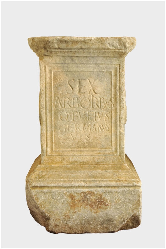 dédicace (latin) : Malgré un effort de centrage du texte, la mise en page est médiocre : le recours à une ligature RI et un V en littera minuta à la ligne 2, n'empêchent pas le débordement du S final d'arboribus sur le cadre. Le lapicide a également été contraint d'accoler les trois dernières lettres de la ligne 4 par manque de place. La gravure, profonde, est d'une largeur variable, parfois très importante (voir E à la ligne 1). La forme des lettres est également très irrégulière (à la ligne 2 par exemple, le premier B est anguleux, alors que les panses du second B sont bien arrondies). Les empattements sont parfois très marqués (X de la ligne 1). Le jambage oblique des R est légèrement flexueux et l'appendice du Q, sinueux, descend sous la ligne et se poursuit jusque sous le F. H. des lettres : l. 1 : 5,3 ; l. 2 : 4 à 4,2 (V : 2,1 ; I : 5) ; l. 3 : 3,3 à 3,5 (V : 3) l. 4 : 2,7 à 3. l. 5 : 2,4 à 2,7., SEX / ARBORIBVS / Q. FVFIVS / GERMANVS / V.S., Sex / Arboribus / Q(uintus) Fufius / Germanus / v(otum) s(olvit)., traduction : A Six Arbres, Quintus Fufius Germanus s'est acquitté de son voeu.