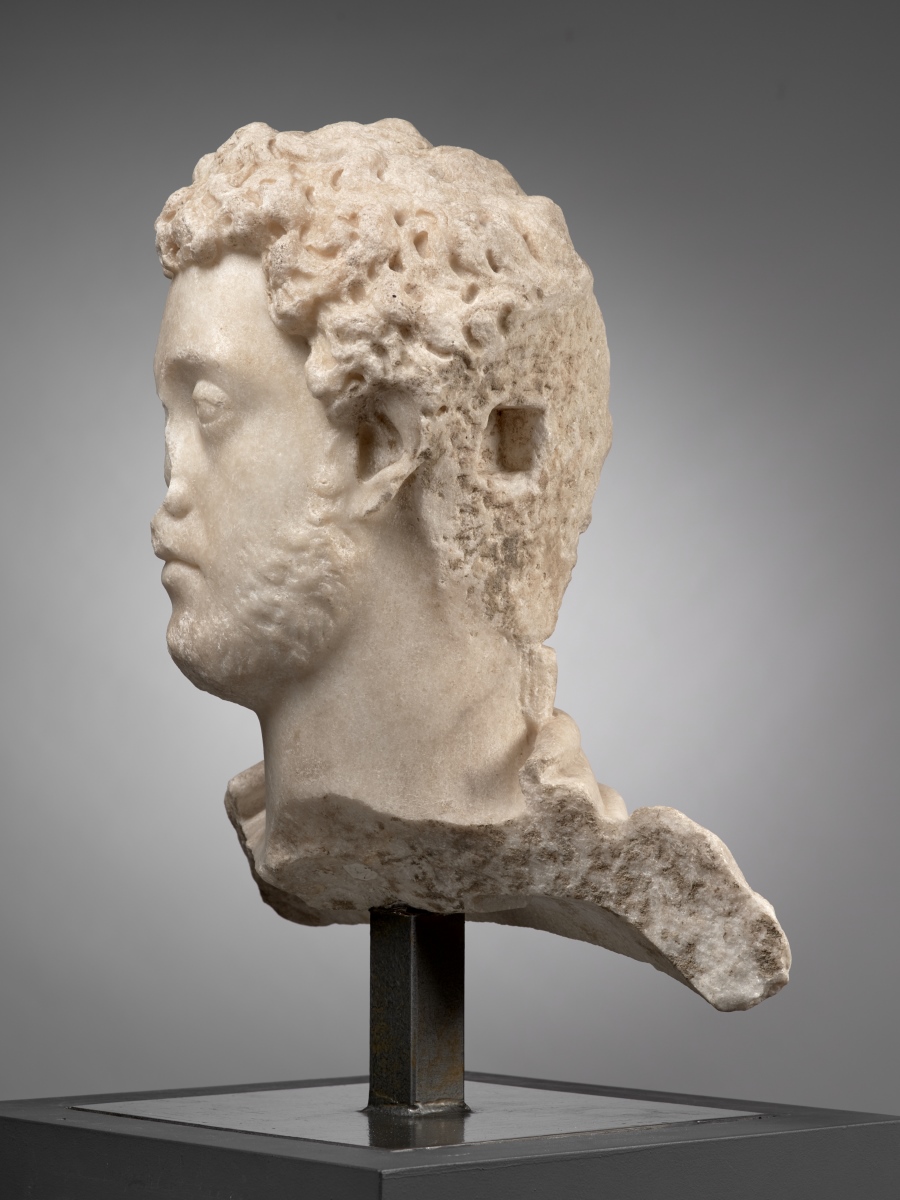 Le sinistre empereur Commode, fils de Marc Aurèle et de Faustine la Jeune, fut le dernier représentant de la dynastie des Antonins. Ce portrait montre pour la première fois l'empereur portant une barbe complète, couvrant les joues et le menton. Commode est alors âgé de 19 ans, il est désormais un adulte. L'imprécision de la chevelure et un curieux flou au niveau du visage, donnent l'impression d'un portrait inachevé. Derrière les oreilles, deux plans de collage et des mortaises sont des traces des fixations de certaines parties qui avaient dû malencontreusement sauter au moment où le sculpteur dégageait le pavillon des oreilles et la nuque.