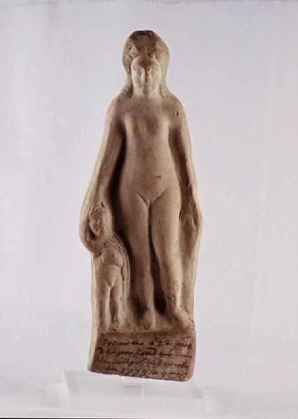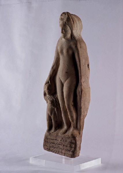 Terre cuite moulée dans un moule bivalve ; femme nue, debout, aux cheveux longs bouclés, partagés par une raie médiane, enserrés dans un diadème qui semble maintenir également le long voile. Celui-ci couvre la tête et l'arrière de la figurine jusqu'aux pieds, englobant les épaules et l'enfant serré contre son flanc droit. Lui-même est nu, il porte une cape et, de sa main droite ramenée sur sa poitrine, tient un objet indéterminé. De la main gauche, il touche la main de Vénus. Les anatomies sont à peine soulignées, Vénus a des hanches larges, des seins ronds, le corps est élégant mais les visages sont grossiers. Il est difficile de préciser s'il s'agit de la déesse s'appuyant sur l'Amour ou bien d'une mère à l'enfant. Évelyne Ugaglia, Notice extraite du catalogue d'exposition « Palladia Tolosa », 1988.