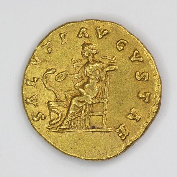 Droit : FAVSTINA / AVGVSTA buste drapé à droite. Revers : SALVATI AVGVSTAE Salus assise à gauche, nourrissant de sa patère un serpent qui s'élève au-dessus d'un autel, et le coude posé sur le dossier du siège.
