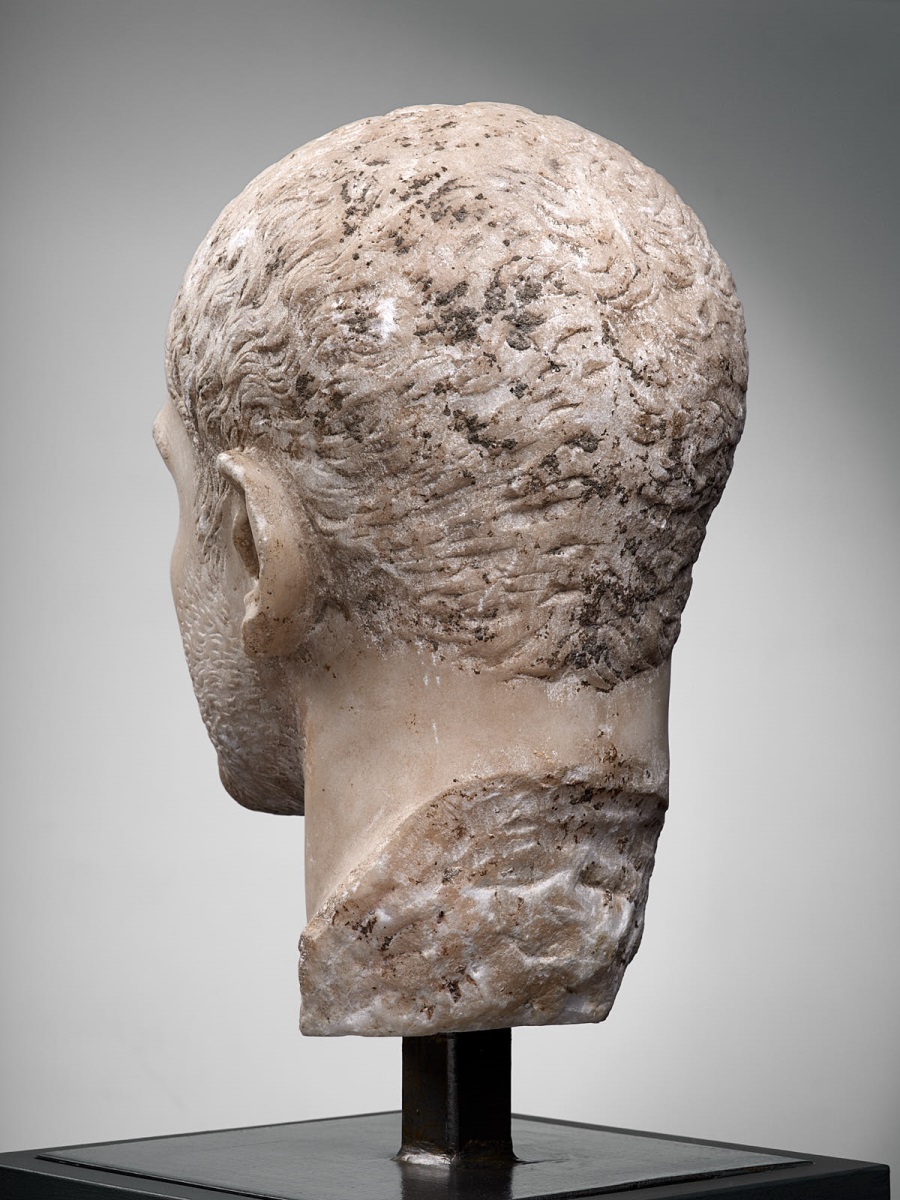 Le mouvement des courtes mèches est rendu autant par des incisions que par une recherche de volume. Barbe et moustache sont indiquées par des griffures. Les yeux relativement globuleux, les paupières supérieures lourdes et le regard dirigé vers le côté sont des caractéristiques du portrait de l'époque des Antonins, reprises par la dynastie des Sévères. Pascal Capus, 2015. ; Marbre d'Afyon (Turquie) Le mouvement des courtes mèches est rendu autant par des incisions que par une recherche de volume. Barbe et moustache sont indiquées par des griffures. Les yeux relativement globuleux, les paupières supérieures lourdes et le regard dirigé vers le côté sont des caractéristiques du portrait de l'époque des Antonins, reprises par la dynastie des Sévères. ; Le mouvement de la chevelure, coupée très court, est rendu autant par des incisions que par le volume des mèches. Barbe et moustache sont indiquées par des sortes de griffures. [Daniel Cazes]