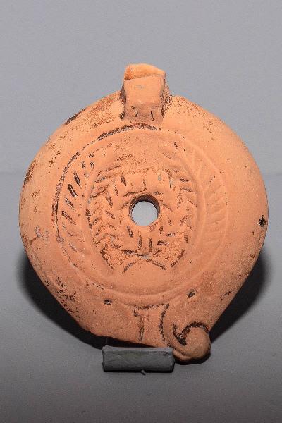 Terre cuite rose orangé, moulée, traces de couverte brune, pâte fine, sigillée ? ; Lampe à volute simple et anse. Type Deneauve V D (dessus). Médaillon délimité par un cercle en creux, deux palmes encadent une couronne de laurier qui cerne le trou d'évent cental.
