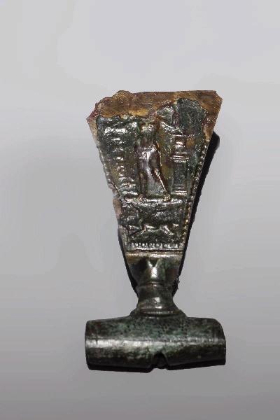 Cette fibule, à ressort caché, présente un décor sur l'arc extra plat et triangulaire. Un personnage féminin nu les bras levés semble tenir quelque chose de la main gauche tandis que la droite est relevée. Le visage a disparu. A sa droite un vase, peut-être un cratère, surmonte une colonne ; à sa gauche un nom est inscrit verticalement, la fin du mot est écrite en retour à son extrémité. Il pourrait s'agir d'une Vénus à la toilette, tenant ses longues mèches de cheveux dans ses mains.