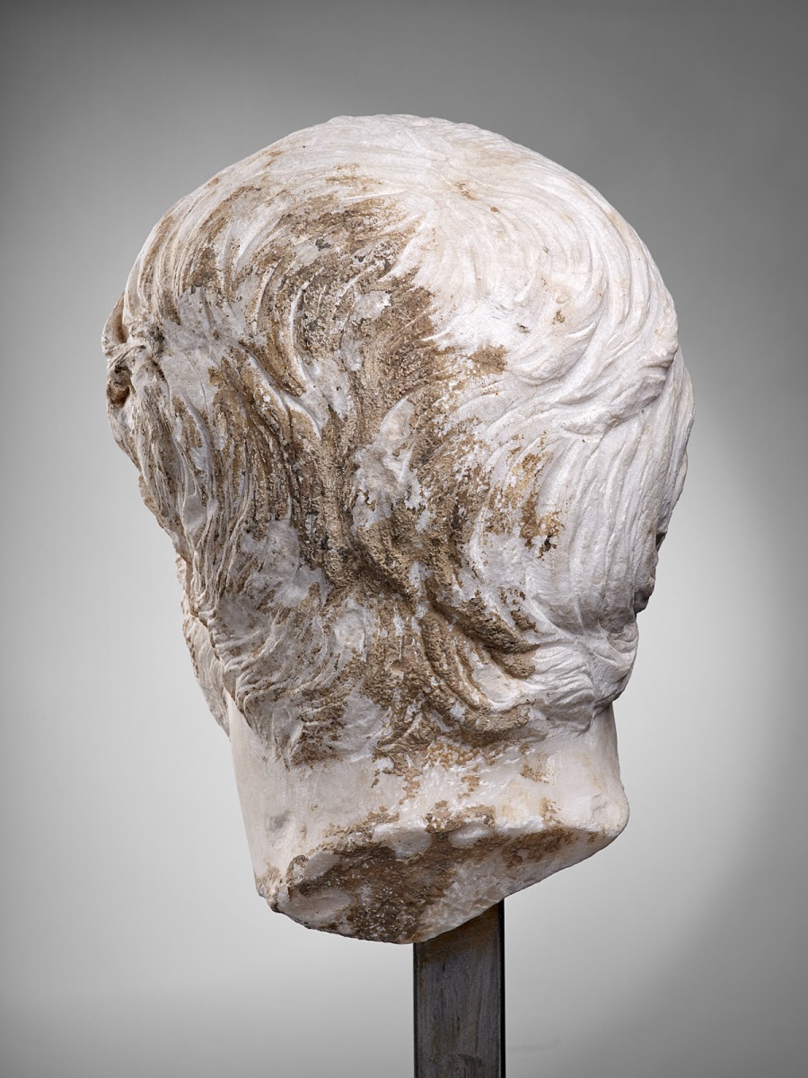 Les larges boucles très souples forment une épaisse chevelure. Le sculpteur privilégie ici le ciseau, qui permet de graver avec finesse chaque détail capillaire, plutôt que le trépan, très utilisé pour les portraits de Lucius Verus ou de Septime Sévère, dont les cheveux et la barbe frisés autorisaient le creusement puissant du marbre. On reconnaît le même personnage dans un portrait conservé à Pérouse (Ombrie, Italie), provenant de Rome ou du centre de l'Italie. Pascal Capus, 2015. ; Marbre de Göktepe (Turquie) Les larges boucles très souples forment une épaisse chevelure. Le sculpteur privilégie ici le ciseau, qui permet de graver avec finesse chaque détail capillaire, plutôt que le trépan, très utilisé pour les portraits de Lucius Verus ou de Septime Sévère, dont les cheveux et la barbe frisés autorisaient le creusement puissant du marbre. On reconnaît le même personnage dans un portrait conservé à Pérouse (Ombrie, Italie), provenant de Rome ou du centre de l'Italie. ; Y transparaît le goût pour l'augmentation du volume et l'animation de la chevelure. D'épaisses et longues mèches suivent un parcours sans ordre, sauvage, s'entremêlant. Barbe, moustache et sourcils sont finement gravés. [Daniel Cazes]