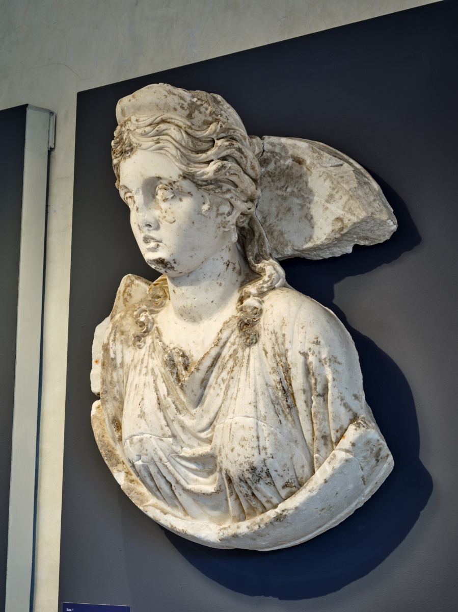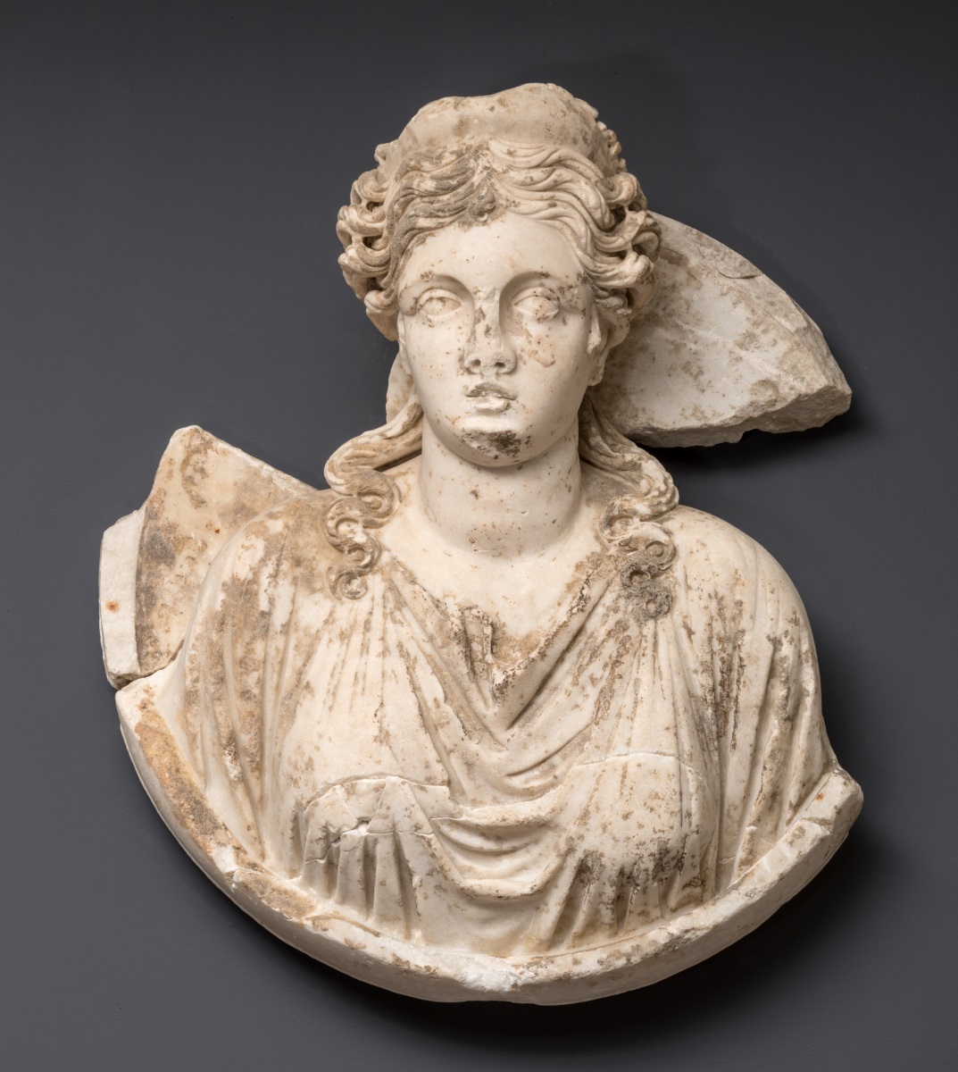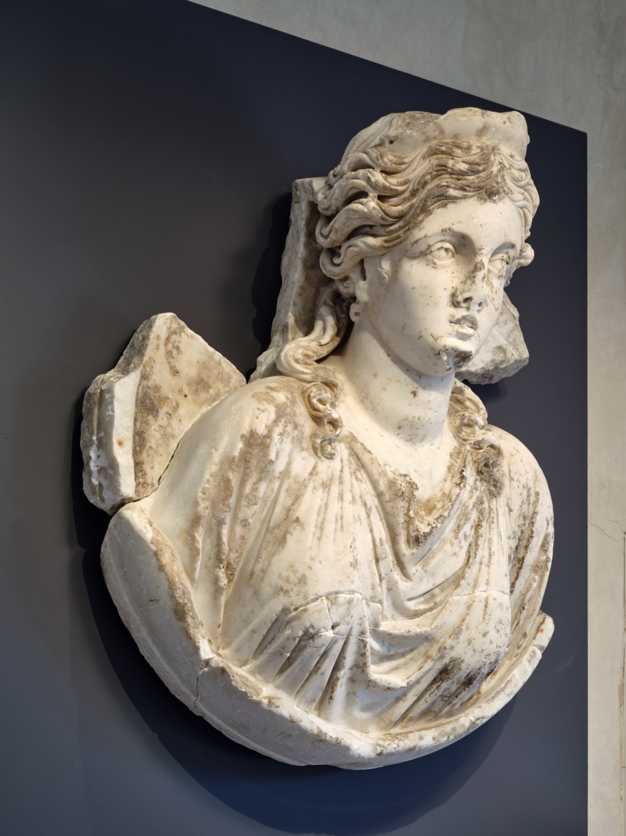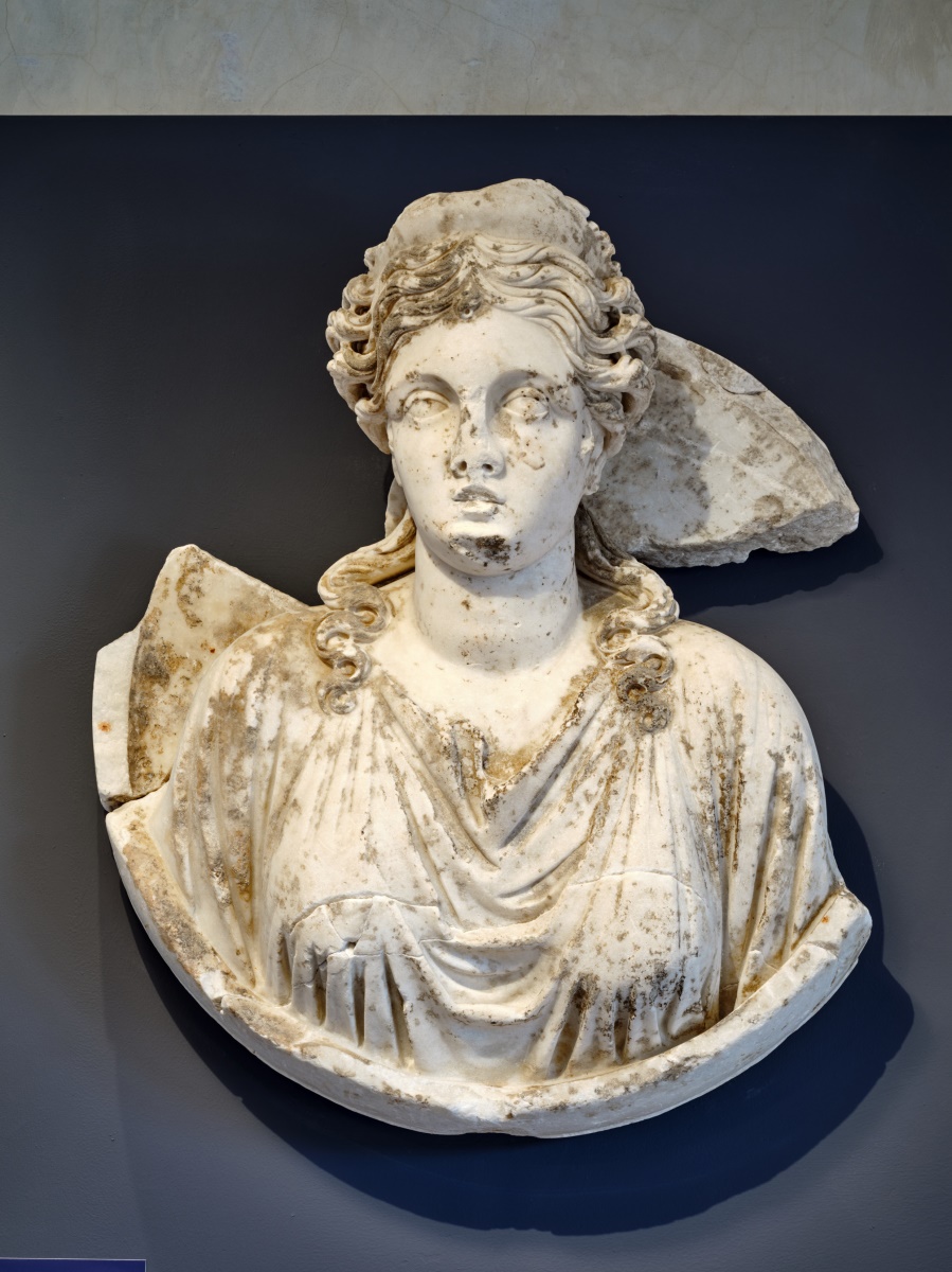 La tête de la déesse, sommée d'un diadème lisse, est difficilement identifiable, tout comme la tête n° 30505 (Vénus ?) à laquelle elle est comparable. [Daniel Cazes]