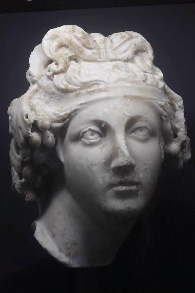 Brisée à la naissance des épaules ; elle est montée sur un piédouche en marbre. Les cheveux, noués très haut, sont ondulés, contenus sur le front par une bandelette et décorés de grappes retombantes de part et d'autre du visage. Les prunelles sont incisées. La partie postérieure du crâne est rapportée, mais ancienne ; le nez érodé, ainsi que la lèvre supérieure. [Henri Rachou, 1912]