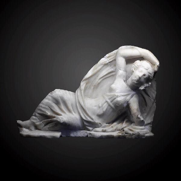 Vêtue d'une tunique qui laisse voir son sein droit, la jeune femme s'appuie sur le coude gauche et soulève de son bras droit replié la draperie qui l'enveloppait. L'avant-bras gauche est brisé ; le socle, moderne, est en marbre de Saint-Béat. [Henri Rachou 1912]